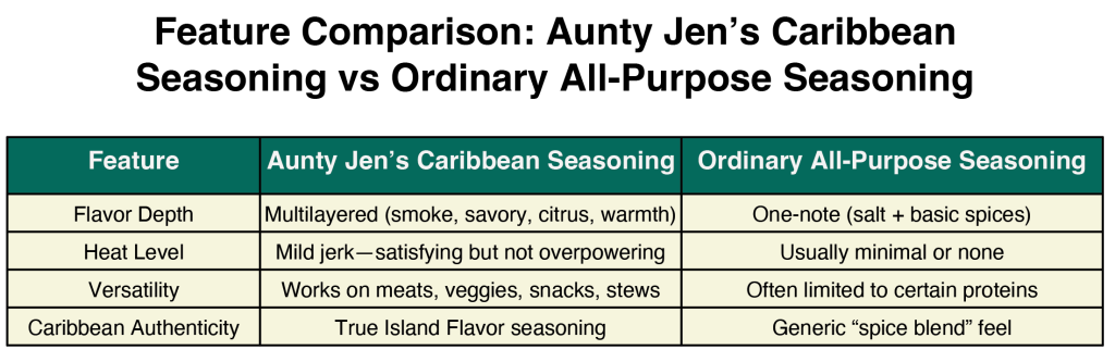 While many jerk or Island blends lean heavily on intense heat, this one is gentler — ideal for those who want island flavor seasoning with balance. The creators of Aunty Jen’s wanted to bring the multi-layered taste of the Caribbean into every dish—grill, roast, stew, or sauté—without the burn.